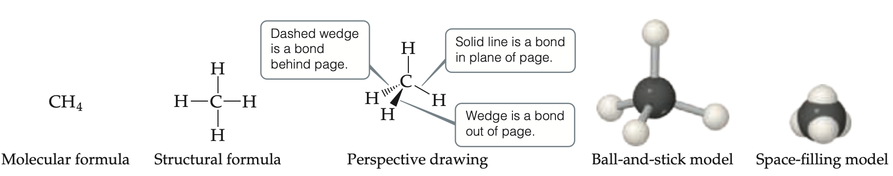结构式能显示其组成原子的结合方式,但不能表示分子的实际几何形状。透视图中的楔形和虚线表示不在纸面上的化学键,显示出一定空间立体结构。球棍模型显示相连原子间角度,空间填充模型显示原子相对大小。