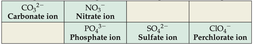 含氧阴离子中,最常见的形式以 -ate,具有相等电荷而少一个氧原子则以 -ite 为后缀命名: