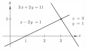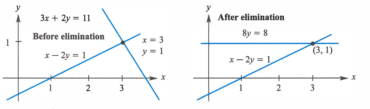 回代 即解得 。若还有第三个方程,则可继续利用消元所得到新的第二个方程消去 。注意到,消元前后的方程组拥有相同的解,如图所示。